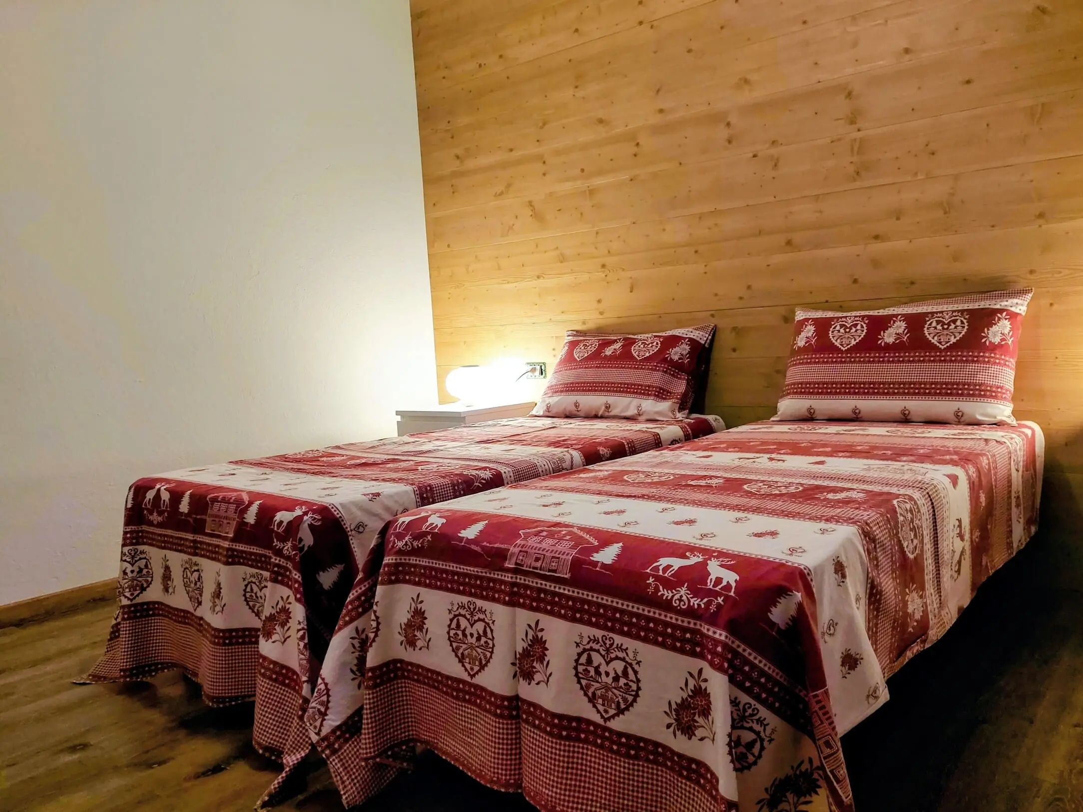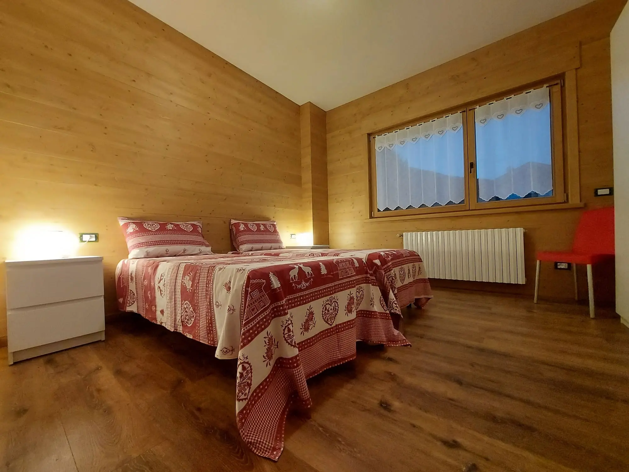 À l’intérieur, le bois naturel, les grandes fenêtres et le mobilier moderne créent une atmosphère chaleureuse et accueillante, idéale pour se détendre après une journée dans les Dolomites. Les deux chambres modulables, la kitchenette équipée et le salon avec canapé-lit rendent l’appartement pratique et confortable en toute saison.